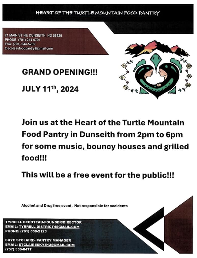 « All Events This event has passed. Heart of the Turtle Mountain Food Pantry Grand Opening July 11, 2024 @ 8:00 am - 5:00 pm « TMCC Culture Camp Turtle Mountain Days ’24 » Add to calendar Google Calendar iCalendar Outlook 365 Outlook Live Details Date: July 11, 2024 Time: 8:00 am - 5:00 pm